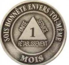 Recto: La bordure porte l’inscription « Sois honnête envers toi-même. ». L’année de sobriété est gravée dans un triangle, entouré des mots « Unité, Service, Rétablissement ».