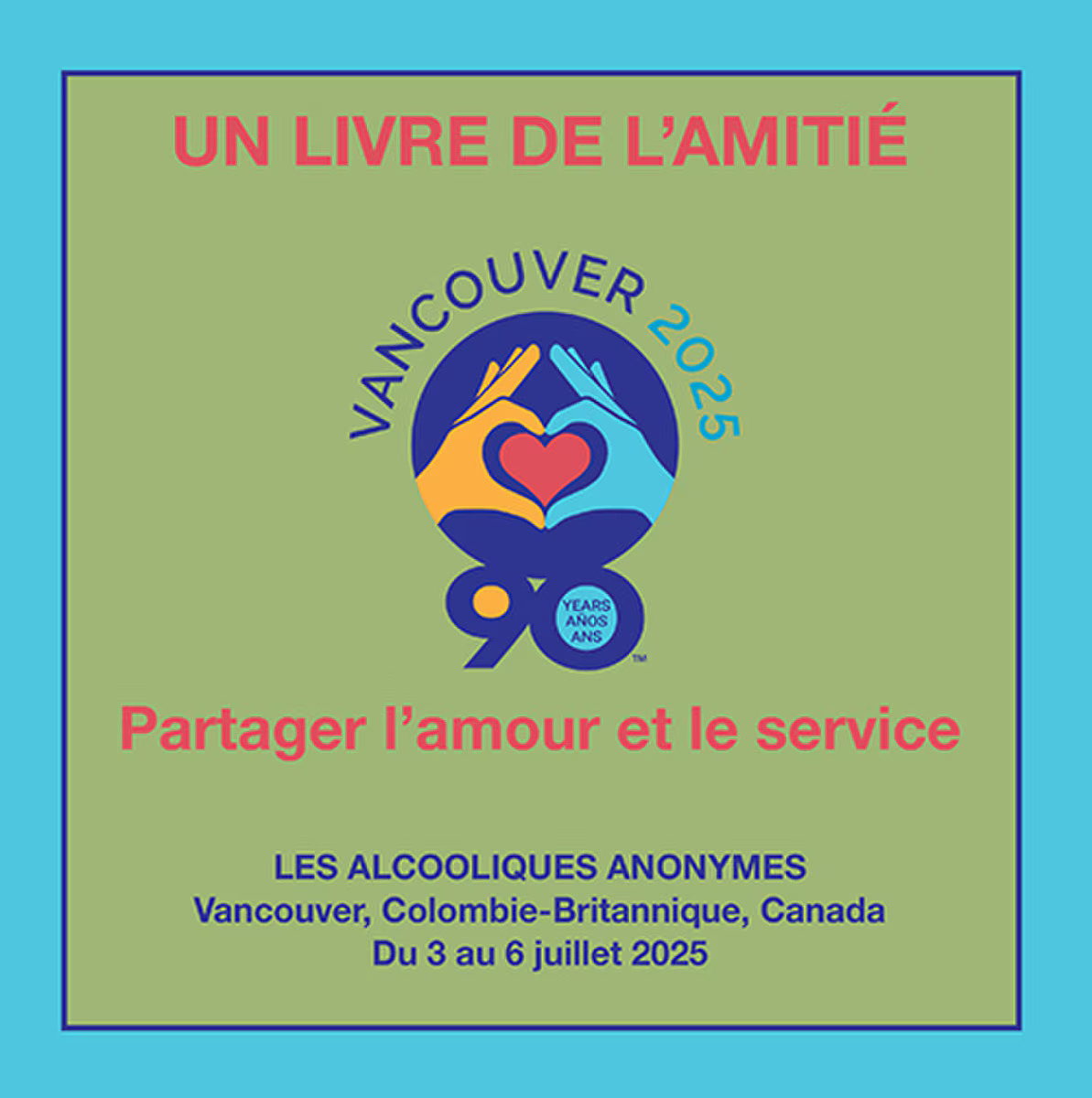 Le livre souvenir du Congrès international de 2025, UN LIVRE DE L’AMITIÉ : 90 années d’amour et de service est une célébration superbement illustrée de notre Mouvement, de sa riche histoire et des AA dans le monde d’aujourd’hui. Dans ces pages en couleurs, vous lirez les histoires inspirantes de Bill W., du Dr Bob et des premiers membres des AA qui ont répandu le message des Alcooliques anonymes, d’un alcoolique à l’autre, dans des cercles de plus en plus larges. Véritable trésor d’archives et de documents inédits, ce volume de la taille d’un livre d’autographes donne vie au message de rétablissement, de service et d’unité qui se trouve au coeur même de notre programme. Comprenant des pages vierges pour les notes et les autographes, UN LIVRE DE L’AMITIÉ : 90 années d’amour et de service sera un souvenir unique du Congrès de Vancouver en 2025.