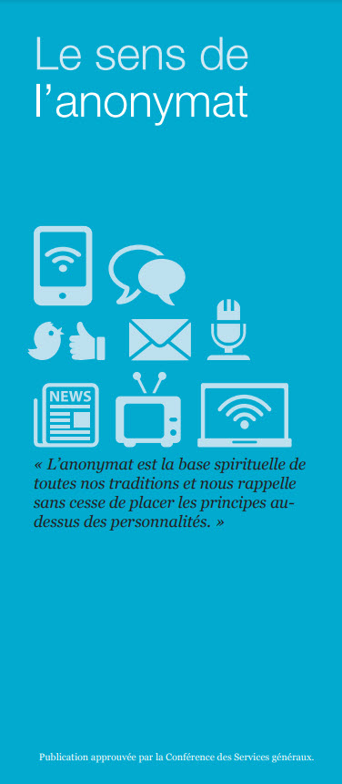 Cette brochure explique comment l’anonymat est à la fois une protection au niveau personnel et un principe spirituel au niveau public, et souligne ce que cela signifie pour les membres des AA, à la fois au sein des AA et à l’extérieur. La brochure contient une FAQ sur les médias sociaux et l’Internet, ainsi que des suggestions sur comment s’y prendre avec les amis et la famille.