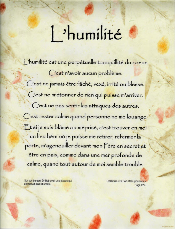 Affichette plastifiée sur l’humilité (8 1/2 X 11) reproduisant le texte d’une plaque que Dr. Bob avait sur son bureau (voir la page 222 de Dr Bob et les pionniers).