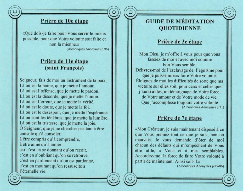 Carte recto-verso comportant les promesses de la 9e étape et la liste des 12 principes sous-tendant les 12 Étapes.