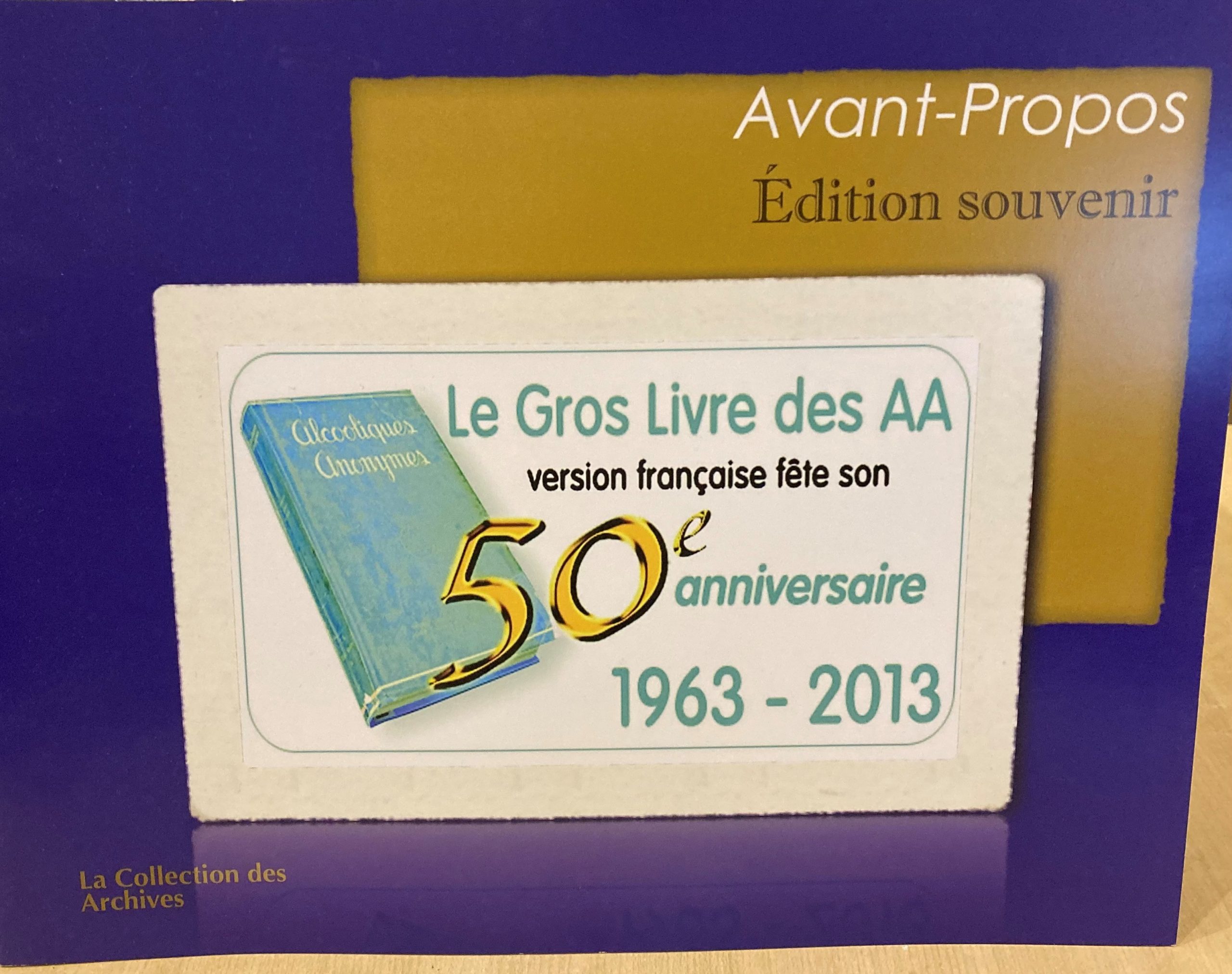 Ce livre regorge de photos de documents d’époque et présente les premières traductions de notre littérature en français, particulièrement celle du Gros Livre effectué par les Éditions Françaises AA en 1963. Les traductions officielles sont aujourd’hui produites par le Bureau des Services Généraux, aux États-Unis.