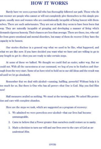 An excerpt in large type from Chapter 5 of the Big Book. This page, which includes the Twelve Steps, is often read at the start of meetings.
