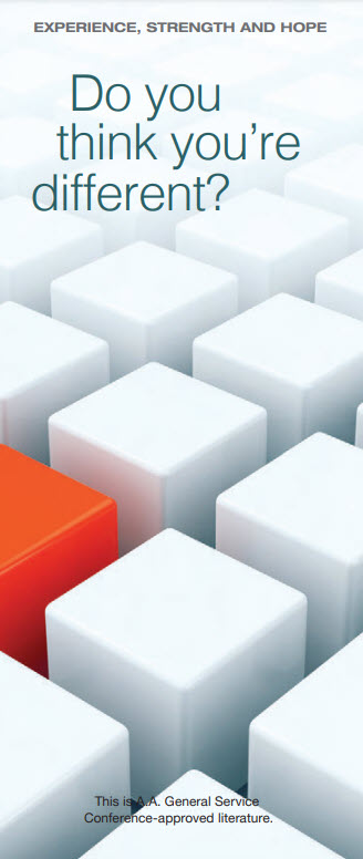 A nice pamphlet sharing stories of A.A. members who recovered from alcohol even though they don’t fit the stereotypical definition of an alcoholic. A.A. is for you, too!