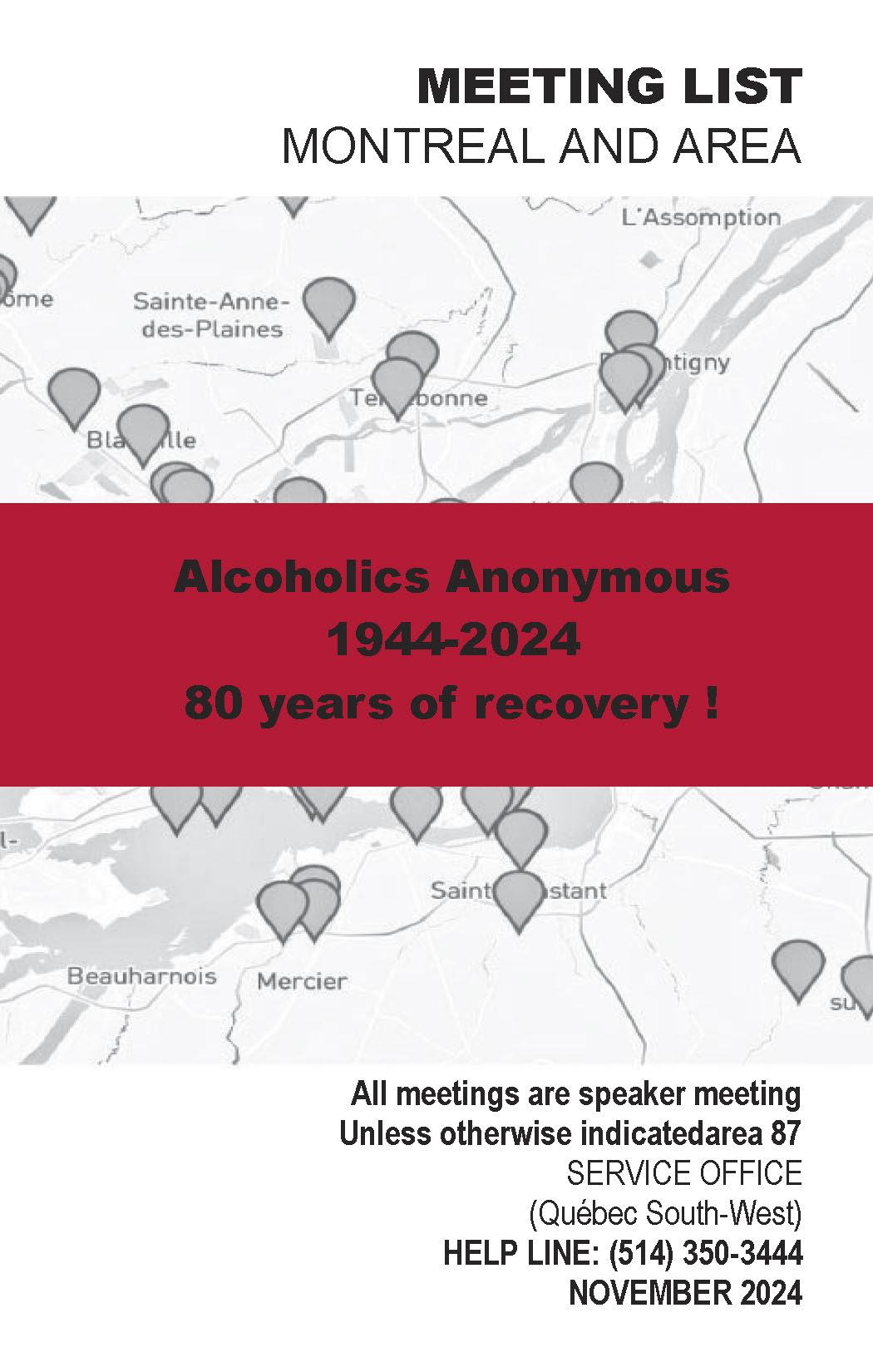 Meeting list – Montreal and area. You may also view the meeting list on Area 87’s website, download the Meeting Guide app, or call the helpline at 514-350-3444 (long distance 1-888-424-2975).