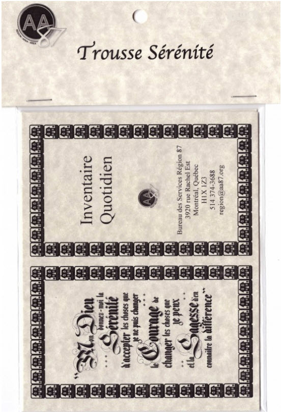 Trousse de sérénité dans une belle pochette de plastique. Ensemble cadeau idéal pour un membre qui commence dans le Mouvement ou à un membre d’expérience qui souhaite travailler son mode de vie.