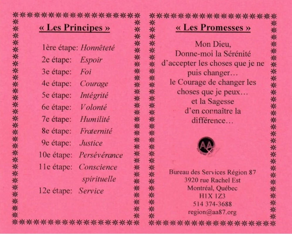 Carte recto-verso comportant les promesses de la 9e étape et la liste des 12 principes sous-tendant les 12 Étapes.
