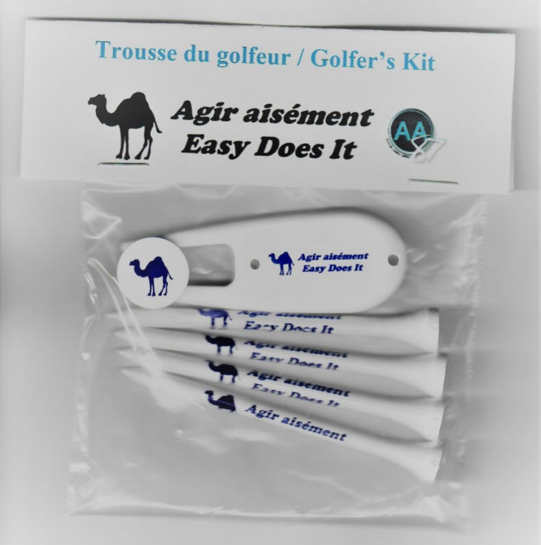 Trousse du golfeur contenant quatre tees, un relève-pitch et un marqueur de balle. Ces accessoires sont imprimés de l’image d’un chameau et du slogan « Agir aisément » / « Easy Does It ».