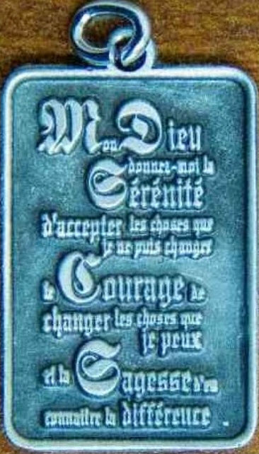 Médaillon de la Prière de la Sérénité en étain pur avec un fini antique laqué. Il peut être porté comme collier ou utilisé comme porte-clés.