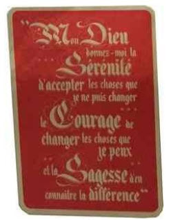 Prière de sérénité sur autocollant avec reflets métalliques. Disponible en rouge, bleu, vert et noir.