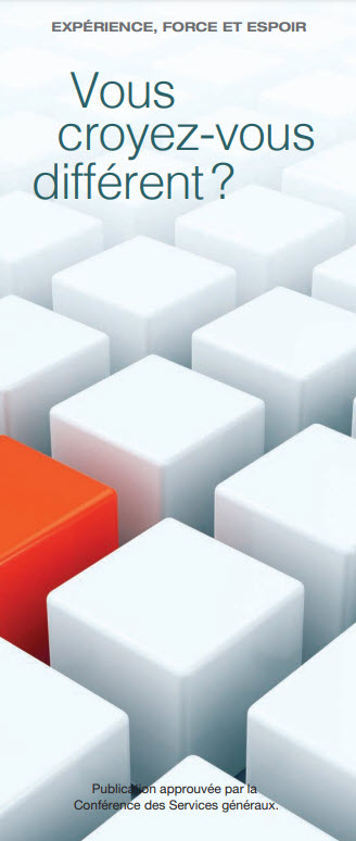 Une belle brochure regroupant des histoires de membres qui ont trouvé l’abstinence chez les AA même s’ils ne correspondent pas au stéréotype de l’alcoolique véhiculé par la société. Les AA sont aussi pour toi!